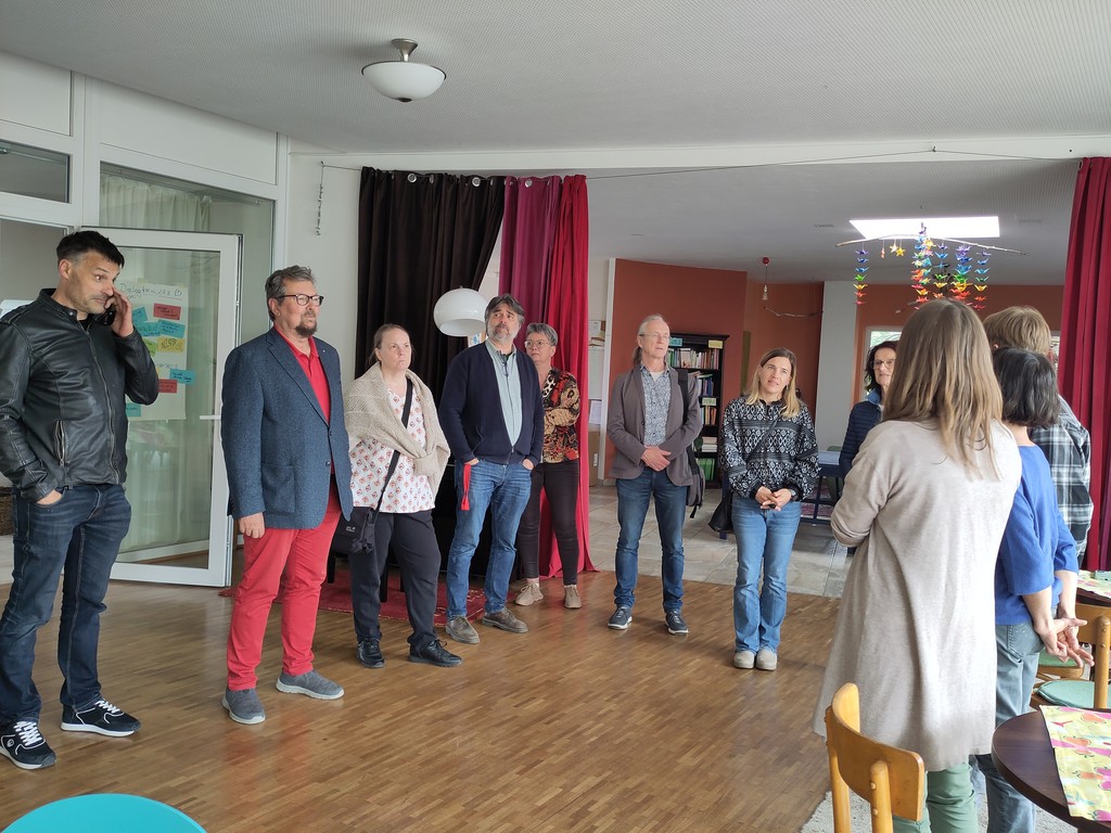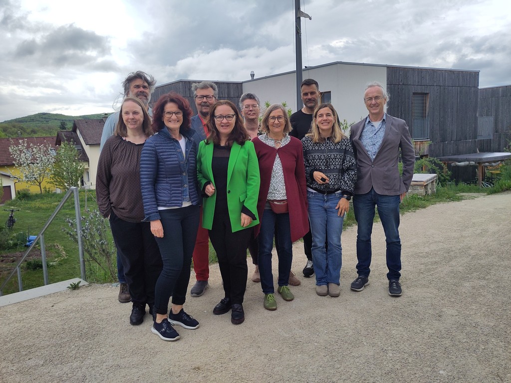 Die Klima- und Energiemodellregion Schwarzatal auf Tour zu Cohousing-Projekten in NÖ. Modellregionsmanagerin Katharina Fuchs (2. v. r.) lud Gemeindepolitiker:innen und Gemeindebedienstete zur Exkursion zu energie- und ressourcenschonenden Vorzeigeprojekten im Wohnbau im Kontext mit Selbstorganisation. Die Stationen: Wohnprojekt BROT-Pressbaum, wo VBGM Ingrid Burtscher von der Stadtgemeinde Pressbaum (3.v.l.) die Teilnehmer:innen begrüßte. Ralf Aydt (1.v.r) und Johanna Leutgöb (3.v.r) von der Initiative Gemeinsam Bauen und Wohnen begleiteten die Exkursion, bei der es auch reichlich Gelegenheit zum Austausch mit den Bewohner:innen gab. 2. Station Wohnprojekt Hasendorf (Gemeinde Sitzenberg-Reidling), 3. Station: Cohousing Pomali (Gemeinde Wölbling).