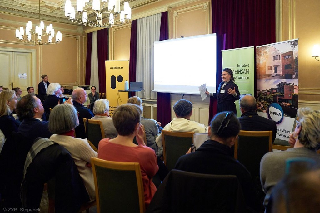 Wie Baugruppen Kooperation und Gemeinwohl stärken. Unter diesem Motto stand das 3. ZxB – Wohngespräch, das am 30.11. im Saal der Bezirksvorstehung Landstraße stattfand. Viele interessierte Besucher:innen nutzten die Gelegenheit, um sich einen Einblick über die Potenziale von Baugruppen im Altbau zu verschaffen! Eileen Stephan von realitylab stellte das Projekt vor und Fr. Bezirksvorsteher-Stellvertreterin Susanne Nückel hieß uns herzlich willkommen und betonte den Wert solcher Forschungsprojekte, die versuchen, zu aktuellen Herausforderungen innovative Ideen zu entwicklen. „Was sind überhaupt Baugruppen und welche positiven gesellschaftlichen Effekte haben sie?“ darüber berichtete Ralf Aydt (Foto 1), Sprecher und Vorstandsmitglied der Initiative Gemeinsam Bauen & Wohnen (IniGBW). In ihrem Input erläuterte Gudrun Pollack, ebenfalls im Vorstand der IniGBW und Bewohnerin des Baugruppenprojekts SchlOR, die unterschiedlichen rechtlichen Modelle des Projekts. Die Möglichkeiten sind sehr weit gefasst und werden jeweils an die jeweiligen Anforderungen und Bedürfnisse angepasst.